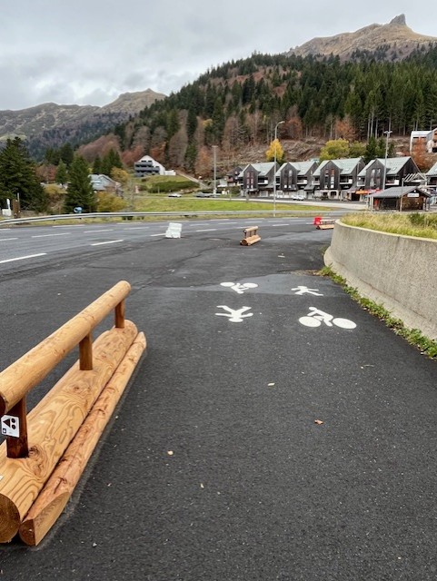 3 – Des pictogrammes au sol et des rondins de bois pour faciliter et sécuriser la circulation des piétons et des vélos entre le centre station et Font d’Alagnon